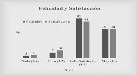 Ambos promedios de la población encuestada son muy similares, y se encuentran dentro de lo que se considera como un nivel satisfactorio de bienestar, de acuerdo con organismos expertos en la materia para México: calificaciones superiores a ocho en cuanto a felicidad y satisfacción de vida (UNAM, 2015), y calificaciones superiores a siete para satisfacción de vida (INEGI, 2015).