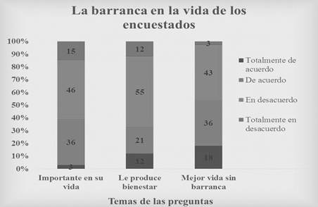 61 por ciento de los encuestados considera que la barranca no es un elemento importante en su vida, en contraste con aquellos que opinan lo contrario (39 por ciento). Incluso aquellos que están totalmente en desacuerdo (15 por ciento) con que la barranca sea importante en sus vidas, supera fuertemente a aquellos que están totalmente de acuerdo con que si lo es (tres por ciento). Con respecto a si la barranca es un elemento que les produce bienestar, se mantiene la opinión y se incrementa, en cuanto a que es mayor el porcentaje (67 por ciento) que considera que no les produce bienestar frente a los que consideran que si se los produce (33 por ciento), aunque los porcentajes de las opiniones que se sitúan en los extremos se equilibran (12 por ciento). Finalmente, respecto a la consideración de si su vida sería mejor si la barranca no estuviera, la opinión muestra un ligero cambio, pues el porcentaje de los que están de acuerdo en alguna medida con este señalamiento (54 por ciento) aún es mayor que los que opinan lo contrario (46 por ciento), aunque la diferencia ya no es tan marcada. Quienes están totalmente de acuerdo con que su vida sería mejor si la barranca no estuviera es de 18 por ciento contra tres por ciento de los que están totalmente en desacuerdo con esta aseveración.