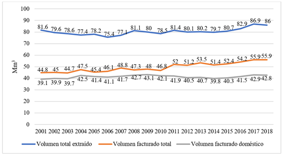 Volumen total extraído (millones de metros cúbicos [Mm3]) CEAG (2006, 2011, 2014, 2018).