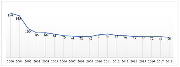 Gráfica 2 Consumo doméstico promedio (litros/habitante/día) (2000-2018)