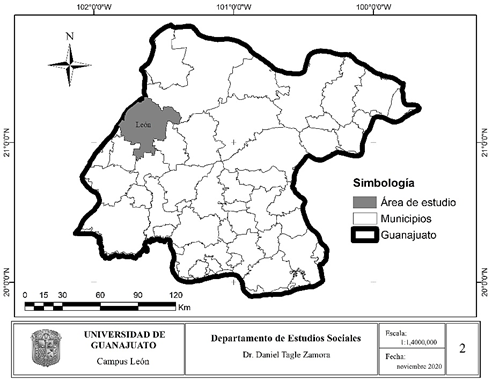 El municipio de León se ubica en el estado de Guanajuato, México. De acuerdo con el Censo de Población Vivienda de 2020, esta ciudad alberga 1,721,215 habitantes (Inegi, 2020), lo que equivale a 27.9% de la población total de la entidad.