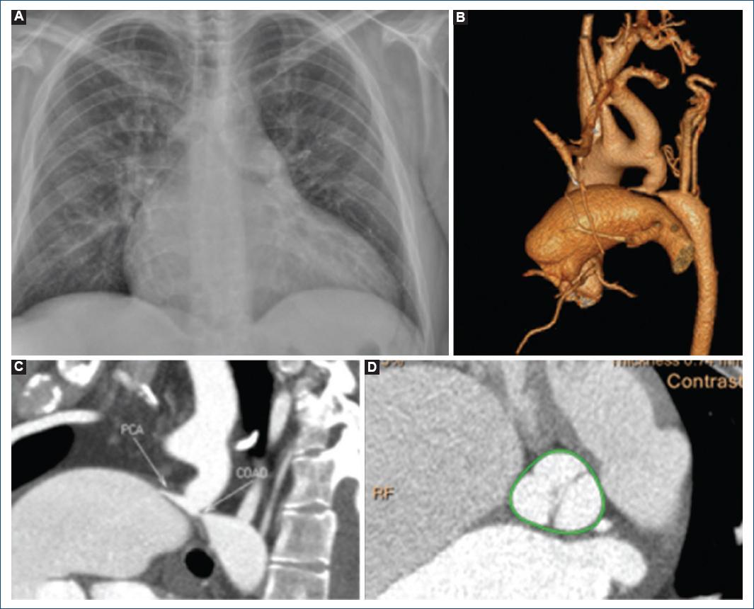 Figura 1 A: radiografía de tórax con cardiomegalia y cefalización de flujo. B: tomografía cardiaca con reconstrucción 3D demostrando coartación posductal con persistencia del conducto arterioso. C: tomografía contrastada, delimitando la coartación y la persistencia del conducto. D: aorta bivalva.