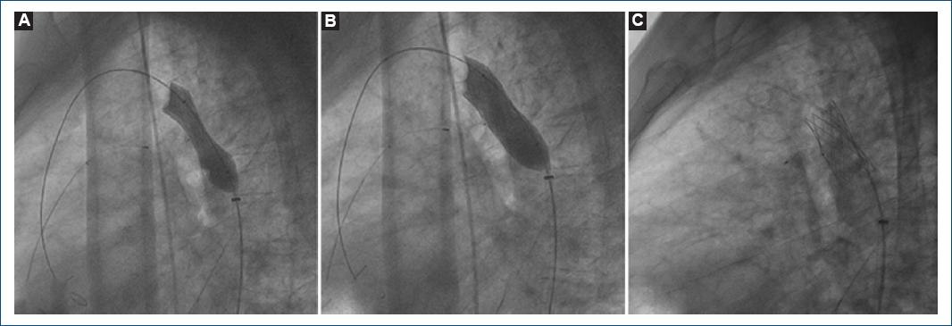 Se decidió utilizar un dispositivo Amplatzer de 6 × 6 mm para realizar la prueba de oclusión del conducto, registrando un descenso de las cifras pulmonares sistólica, diastólica y media a 46, 21 y 29 mmHg, respectivamente (ratio Pp/Ps < 0.5) y 6 unidades Wood. El paciente se mantuvo asintomático, por lo cual se liberó el dispositivo. Para la coartación, al poseer adecuada anatomía y sin evidencia de aneurismas, se decidió realizar aortoplastia con stent metálico PALMAZ 40 mm (Fig. 2). El ecocardiograma de control reportó cierre del conducto sin shunt residual y con función sistólica del ventrículo derecho conservada, TAPSE 17 mmHg y onda S de 10 cm/s, además de corroborar la estenosis aórtica moderada con un área valvular de 0.9 cm2/m2, gradiente medio de 36 mmHg y Vmax de 3.75 m/s. El gradiente medio de la aorta descendente era 8.3 mmHg. El paciente fue egresado por mejoría. Se evaluarán el comportamiento hemodinámico y las resistencias pulmonares, y se hará seguimiento de la estenosis aórtica moderada.