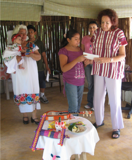 Laura Machuca Victoria Novelo con la escritora maya Patricia Martínez Huchim en un jetzmek o "bautizo" maya en 2012.