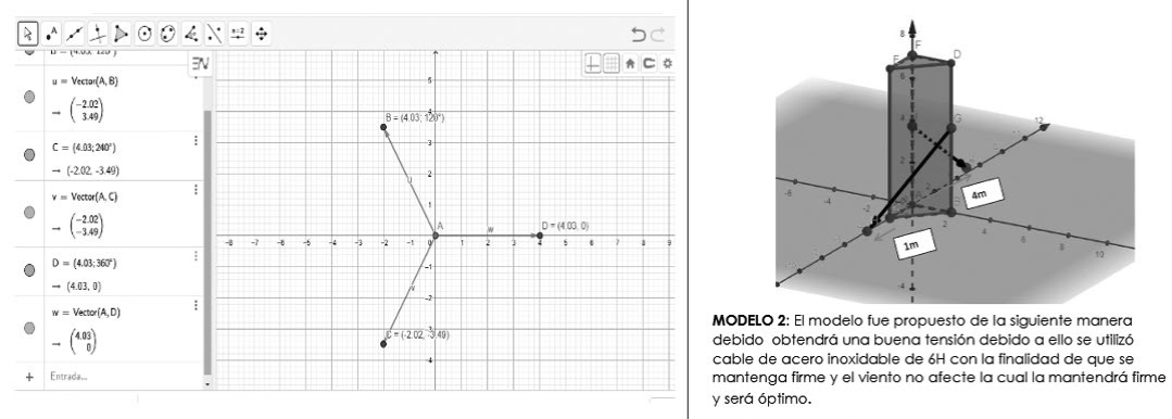 a) Como parte de la secuencia didáctica se estimula el uso de la tecnología, la herramienta que se usó fue GeoGebra destacando el valor didáctico que tiene el instrumento para hacer modelos bi y tridimensionales, desde el enfoque geométrico. El uso del enfoque geométrico de vectores para la física lo describe Notaroš (2013), con éste los estudiantes aumentan la comprensión, ya que aprenden de forma intuitiva y visual, lo cual les permitirá modelar y resolver ejercicios que impliquen vectores. Véase Figura 3.