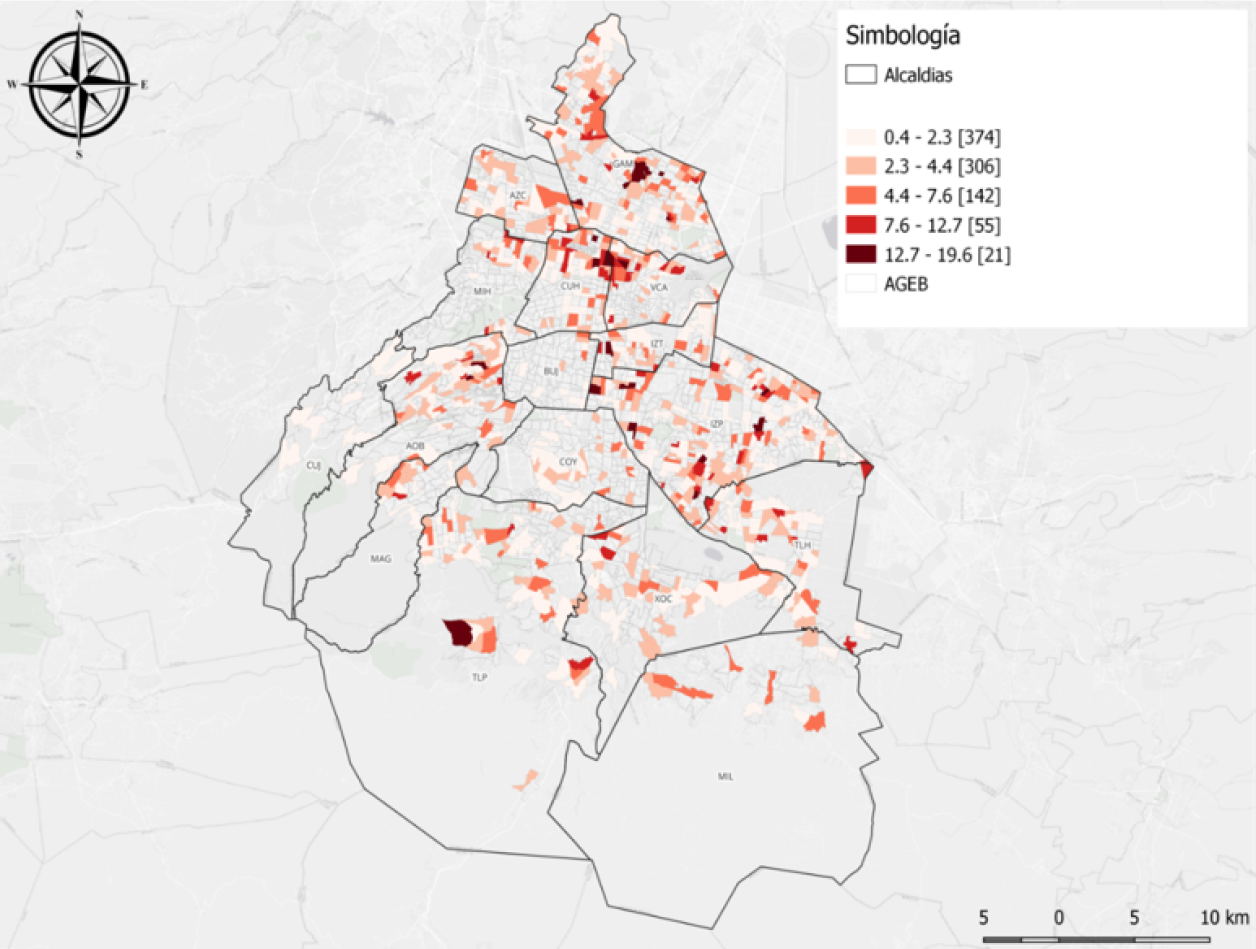 Dado el objetivo del estudio, resulta necesario establecer algunas precisiones de carácter metodológico. Un criterio para operacionalizar la discusión teórica es el de la factibilidad empírica. Esto es construir variables con base en fuentes disponibles y tratar, según criterios técnicos, al conjunto de información para maximizar los controles y minimizar los sesgos. Un elemento que hace crucial la factibilidad es una correcta selección de la unidad de registro. En este caso son las Áreas Geoestadísticas Básicas (AGEB) de la Ciudad de México del Censo de Población y Vivienda del 20204 del Instituto Nacional de Estadística y Geografía (INEGI).