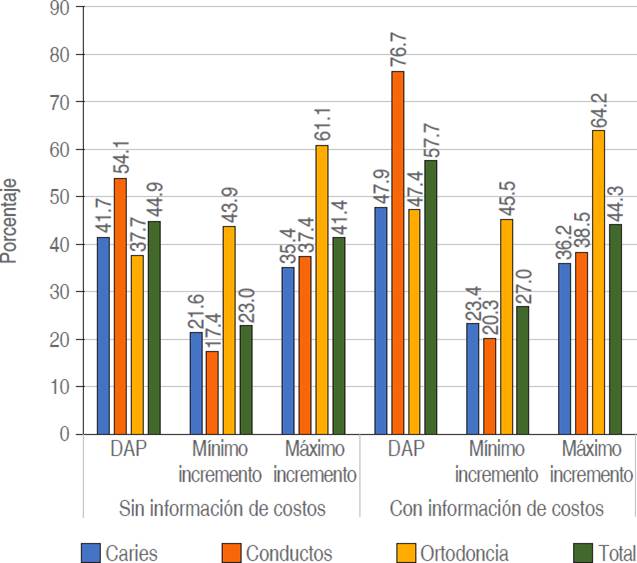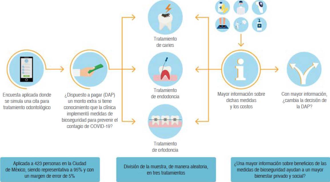 El estudio, a través de encuestas aplicadas a personas de los Estados Unidos Mexicanos, evidencia que aproximadamente 32% de los encuestados cancelarían su cita odontológica debido a la presencia del COVID-19; sin embargo, casi un 45% tendrían DAP un monto extra en la cita, si el consultorio o clínica donde asiste implementa medidas de bioseguridad, y aumentaría hasta un 58% si los encuestados tienen mayor detalle de las medidas implementadas, ventajas y desventajas, y de los costos en los que incurre la clínica.