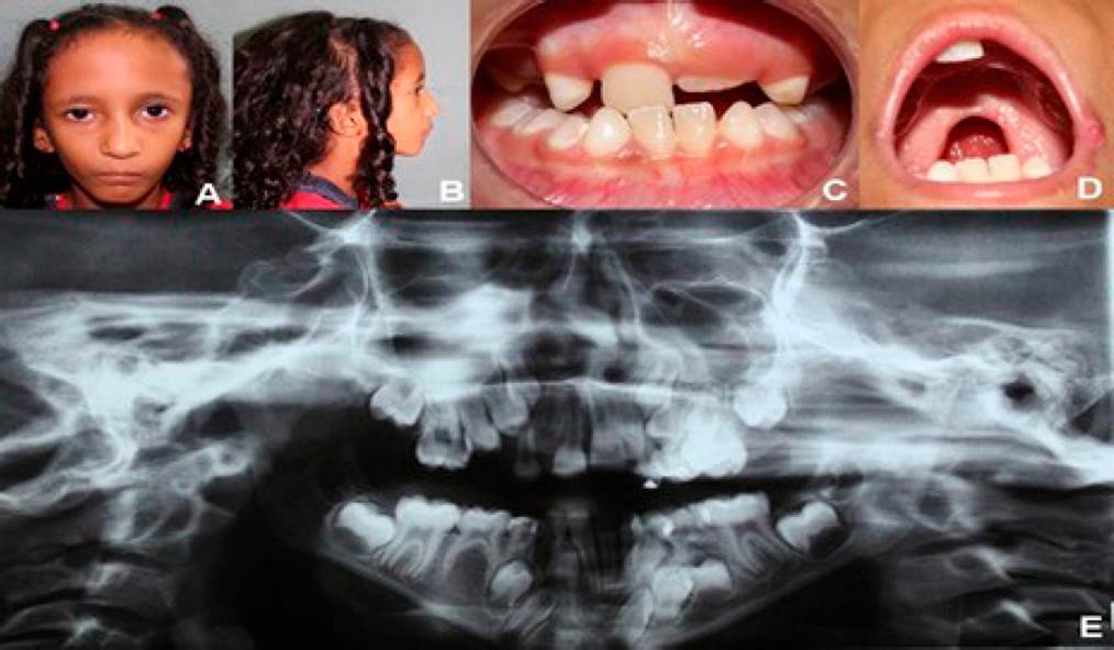 Figura 1 Fotografías del caso clínico. A. Vista frontal evidenciando rostro triangular, con desproporción entre los tercios faciales y micrognatia. B. Vista lateral: frente prominente e implantación baja de las orejas. C. Vista frontal oclusal: mordida cruzada anterior y posterior, agenesia y atraso en la erupción dentaria. D. Vista intraoral: Presencia de hendidura palatina post-foramen completa. E. Ortopantomografía mostrando atraso de erupción dentaria, impactación y agenesia.