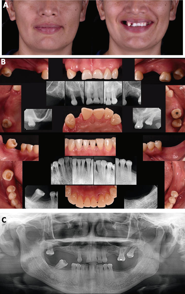 Figura 1 Estudios iniciales. A. Fotografías extraorales de frente y sonrisa. B. Radiografías y fotografías de arcada superior y radiografías y fotografías de arcada inferior. C. Ortopantomografía.