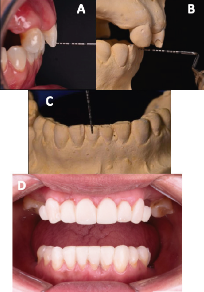 Una vez obtenidos los elementos de diagnóstico (modelos de estudio, radiografías y fotografías intraorales y extraorales), se procedió a realizar los análisis correspondientes, y con los modelos articulados en relación céntrica se elaboró un encerado de diagnóstico. Previo a la intervención periodontal, a partir del encerado de diagnóstico se elaboró un mock-up (Protemp™, 3M™) para establecer las proporciones dentales y los contornos gingivales deseados (Figura 2. D); de este modo se logró entablar comunicación con el periodoncista y tener los objetivos finales del tratamiento en común. El tratamiento se llevó a cabo en las cuatro fases: