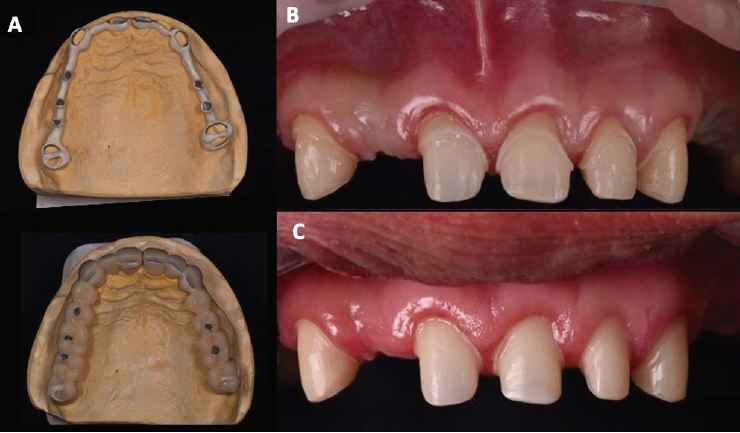 En la Fase I se realizaron extracciones de los dientes 26 y 47, ya que presentaban un pronóstico periodontal sin esperanza. Se optó por mantener temporalmente los terceros molares superiores con el fin de utilizarlos como pilares para los provisionales. Los dientes 31 y 32 presentaban un pronóstico periodontal regular y pobre respectivamente, por lo que se decidió realizar una regeneración ósea en la zona interdental. Se colocaron implantes en los dientes 36, 46, se realizó la elevación de ambos senos maxilares y se colocaron implantes en los dientes14 y 16. En la Fase II, se prepararon los dientes de la arcada superior 13, 11, 21, 22, 23, se optó también por preparar y mantener temporalmente los terceros molares 18 y 28 para soportar un provisional de acrílico (AlikeTM, GC® America Inc) seccionado en hemiarcada de central a tercer molar, con refuerzo de estructura metálica (Figura 3. A). Se realizó de esta manera debido a los largos periodos de cicatrización que se presentarían durante el tratamiento, para evitar fracturas por la longitud de las brechas desdentadas y para mantener dimensión vertical. Se realizaron alargamientos de corona en los dientes 13, 11, 21, 22, 23 (Figura 3. B). Un mes después se re-prepararon los dientes para colocar el margen a nivel equigingival. Se tomó una impresión con alginato (Hydrogum 5, Zhermack® Dental) para realizar un nuevo encerado y un nuevo provisional de acrílico utilizando la misma estructura metálica del provisional anterior (Figura 3. C). En la arcada inferior se realizaron preparaciones horizontales para carillas en los dientes 31, 32, 33, 41, 42 y 43 con el fin de restituir el tejido dental perdido y lograr un contacto con los dientes superiores. Se colocó un provisional de resina bisacrílica (Protemp™, 3M™).