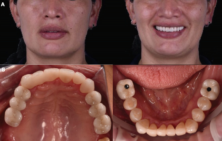 Figura 4 Fotografías finales. A. Fotografías extraorales de frente y sonrisa. B. Fotografías intraorales, superior e inferior.