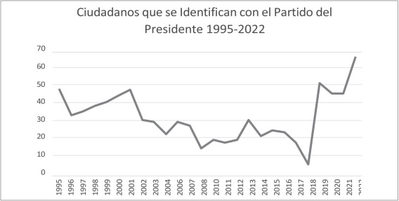 El trabajo de Moreno (2018: 42) muestra también que en general el partidismo (lo cual incluye también al partido del presidente), si bien ha tenido sus altas y sus bajas, desde una perspectiva amplia en el tiempo, “se ha venido debilitando”. Después de ese incremento del panismo con la llegada de Fox al poder en 2000, el apoyo de los ciudadanos identificados con el partido del presidente ha disminuido. El análisis de Moreno llega hasta 2017 (2018: 49), pero su trabajo ya registra desde 2014 un cierto crecimiento del partidismo del Movimiento de Regeneración Nacional (MORENA).