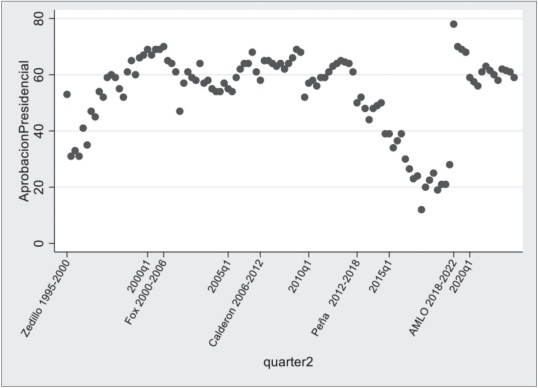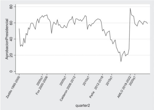 En México lo que se ha escrito sobre la aprobación presidencia, raras veces toma al tiempo como determinante clave. Villarreal (1999) muestra que la percepción de los individuos sobre el desempeño económico tiene un fuerte efecto positivo en sus opiniones sobre el presidente Carlos Salinas (1988-1994). Kaufman y Zuckermann (1998) argumentan que las evaluaciones retrospectivas de los votantes sobre la economía nacional y el estado de sus finanzas personales impactaron su apoyo en las políticas del presidente Salinas, a lo largo de dos momentos distintos en el tiempo, 1992 y 1994, aunque no incluyen la variación real del tiempo como en su análisis. Somuano (2018) compara los factores que determinan la aprobación presidencial de dos presidentes mexicanos: Felipe Calderón (2006-2012) y Enrique Peña Nieto (2012-2018), sin embargo, el tiempo está fuera del análisis. Gómez-Vilchis (2012a y 2012b) examina la aprobación presidencial en México de 1994 a 2006, antes y después de las elecciones críticas de 2000. Sin embargo, su estudio no es un análisis de serie de tiempo.