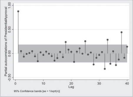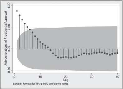 Así, los pasos o direcciones futuras de la serie no pueden predecirse sobre la base de la historia pasada (Becketti, 2020: 378). La hipótesis alternativa es que la variable no contiene raíz unitaria, es decir, la aprobación presidencial fue generada por un proceso estacionario. Los resultados de las pruebas DF (.078) y PP (.077) indican que se deben rechazar las hipótesis nulas y que la variable aprobación presidencial no tiene una raíz unitaria. La variable es estacionaria, (media y varianza constantes). Algo bueno en el análisis.