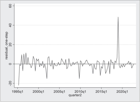 La importancia de la prueba de diagnóstico en las series de tiempo es que a través de ella es posible identificar las limitaciones y problemas del modelo, en específico, si el modelo es estacionario, si los residuos tienen una distribución homogénea, y si es invertible (proceso autorregresivo infinito, Becketti, 2020: 210). Estas características permiten desarrollar modelos más eficientes, más exactos en términos estadísticos. El tercer paso para diseñar modelos de análisis de series temporales, específicamente ARIMA, es la verificación de diagnóstico basada en la prueba de Ruido blanco de Portmanteau7. La Gráfica 5 muestra que todos los residuos están consistentemente alrededor de la media del error. Los únicos valores que parecen críticos aparecen entre 2017 y 2018. Esta evidencia sugiere que el modelo tiene ruido blanco, pero el análisis necesita una prueba formal, como la que presenta el Cuadro 4. La hipótesis nula de la prueba de Portmanteau es que los residuos son ruido blanco. El valor P es .97, mayor que .05. El análisis no puede rechazar la hipótesis nula. En consecuencia, el análisis puede confirmar con la prueba que los residuos son ruido blanco. Cuando los residuos no son ruido blanco, no son normales, no tienen media cero ni se autocorrelacionan seriamente. Entonces el modelo no sería del todo adecuado. Este no es el caso del presente análisis, en el cual los residuos son Ruido blanco.