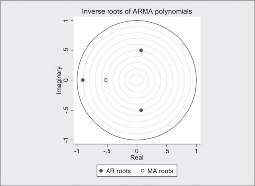 Los últimos pasos para el diagnóstico con modelos ARIMA son: (1) verificar si el proceso ARIMA estimado es (covarianza) estacionario, lo cual implica que la media y la varianza son constantes en el tiempo (Becketti, 2020: 208); (2) comprobar si el proceso ARIMA estimado es invertible, (un proceso autorregresivo infinito) (Becketti, 2020: 210).