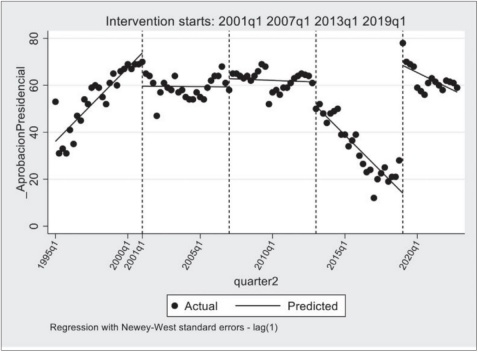El análisis de series de tiempo interrumpidas permite observar cuáles de estos cortes específicos afectan la tendencia y el nivel de la aprobación presidencial de manera significativa en términos estadísticos. Así como reconocer qué tipo de elección es a partir de la relación del proceso electoral con la variación del apoyo por el Ejecutivo. Como muestra el Cuadro 5 y la Gráfica 7, el nivel inicial de aprobación presidencial (la constante) se estima en un 36 por ciento, y la aprobación aumentaba significativamente cada trimestre en un 1.57 por ciento (durante el período de Zedillo, 1995-2000), antes de la llegada de Vicente Fox (2000-2006) a la presidencia de la República, tras las elecciones críticas de 2000. Después de eso la aprobación presidencial claramente va disminuyendo, de Fox a Peña Nieto (2012-2018).