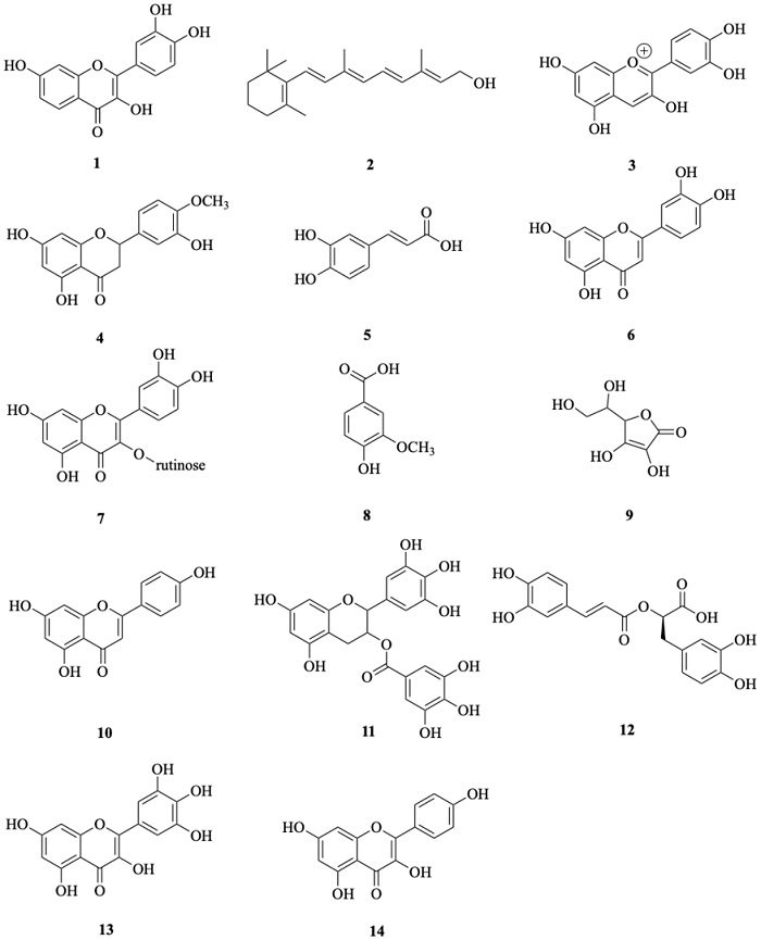 Ergosterol was used as 1O2 chemical trap in the determination of the photosensitizing ability through reactions of the photo-oxidation of ergosterol. 14 antioxidants were tested: Fisetin (1), retinol (2), cyanidin (3), hesperetin (4), caffeic acid (5), luteolin (6), rutin (7), vanillic acid (8), ascorbic acid (9), apigenin (10), epigallocatechin gallate (11), rosmarinic acid (12), myricetin (13) and kaempferol (14) (Fig. 1). For each reaction, 1 mM ergosterol and 144 (M antioxidant (initial concentration) was prepared in ethanol [15]. The solution was placed inside a photo-oxidation camera and irradiated (four compact fluorescent lamps) during 2 h under continuous oxygen flux (medicinal grade oxygen, flux rate: 75 mL/s), bubbled using a stainless-steel filter (10 (m HPLC filter). The light intensity was 19623 ±129 lux (YK-10LX light meter). The temperature inside the photo-oxidation camera was 32 °C ± 2. In order to establish reference controls, the photo-oxidation reaction by adding eosin yellowish 144 (M was established as positive control (+) and the reaction without a photosensitizer dye as negative control (−). Sodium azide (1 mM) was used to confirm 1O2 generation in photo-oxidation reactions.