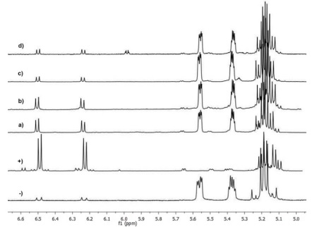 Fig. 2 1H-NMR spectra of mixtures reaction obtained from photo-oxidation reactions carried out with (a) fisetin, (b) retinol, (c) cyanidin and (d) hesperetin. Control (−): reaction without photosensitizer, Control (+): reaction with eosin yellowish as photosensitizer.
