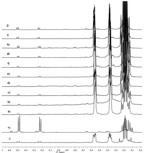 Fig. 4 1H-NMR spectra of mixtures reaction obtained from photo-oxidation reactions carried out with (a) caffeic acid, (b) luteolin, (c) rutin, (d) vanillic acid, (e) ascorbic acid, (f) apigenin, (g) epigallocatechin gallate, (h) rosmarinic acid, (i) myricetin, (j) kaempferol. Control (−): reaction without photosensitizer, Control (+): reaction with eosin yellowish as photosensitizer.