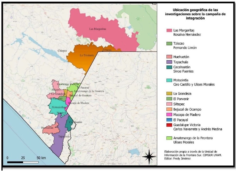 La distribución geográfica de las investigaciones efectuadas hasta la fecha sobre la campaña de integración en la región fronteriza de Chiapas con Guatemala puede apreciarse en el mapa 1.