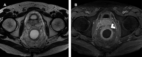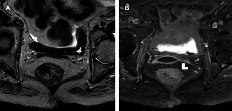 Figura 1: A) Resonancia magnética (RM) de recto en secuencia T2 con gel endorrectal, muestra tumor circunferencial del recto inferior, que no involucra la muscular propia. B) Mismo paciente, RM en secuencia T1 con saturación grasa y gadolinio muestra infiltración del tumor que involucra la muscular propia y la grasa mesorrectal (punta de flecha).