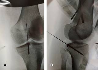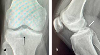 Figura 1: Radiografías de rodilla derecha anteroposterior (A) y lateral (B), en esta última se muestra discontinuidad ósea en la superficie posterior articular tibial (flechas).