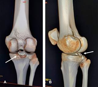 Figura 2: Imágenes de reconstrucción 3D de tomografía computarizada de rodilla derecha. A) Vista posterior, desplazamiento superior de fragmento óseo que corresponde a fractura avulsión del ligamento cruzado posterior. B) Vista oblicua, muestra la misma lesión (flechas).