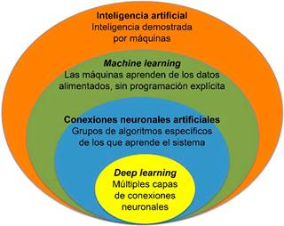 La teoría de la IA se concibe como un todo de acuerdo al elemento a analizar, y por ello que es considerada hoy por hoy como el cuarto momento histórico de la revolución tecnológica, partiendo de que la IA es demostrada por la capacidad de inteligencia de las propias máquinas, seguido de “machine learning”, la cual aprende de la información previamente proporcionada, sin necesidad de antes ser programada de manera explícita; posteriormente, en una capa más interna, se obtiene la alimentación de grupos de algoritmos donde se sustenta la base de datos de la cual parte el sistema; finalmente, el “deep learning” conjunta todas esas capas, como un sistema nervioso central humano, que provee un “sistema neuronal artificial de conexiones”, el cual no es cognoscible para los humanos y que es generado por las propias máquinas (Figura 3).41