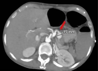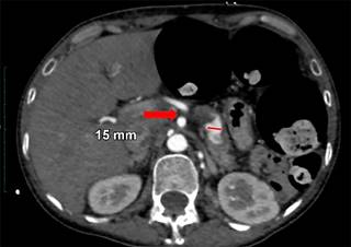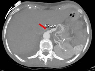 Figura 2: Tomografía computarizada a las 24 horas con ligero aumento del diámetro del aneurisma esplénico a 15 mm.