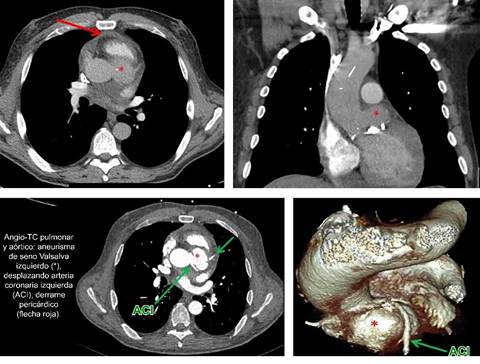 Su complicación más frecuente, y potencialmente fatal, es la rotura, siendo mayor para los aneurismas localizados en el seno derecho.3 Su diagnóstico se establece generalmente en el contexto de una complicación o rotura, ya que la mayoría de ellos son asintomáticos. Sin embargo, con el aumento en el número de pruebas de imagen, algunos se diagnostican de forma incidental en estudios de imagen realizados por otros motivos o en cirugías cardiacas indicadas por otra patología.