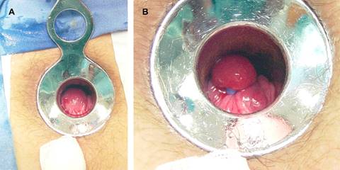 Figura 2: Procedimiento de ligadura hemorroidal con bandas de silicón, (A) antes y (B) después de la colocación.