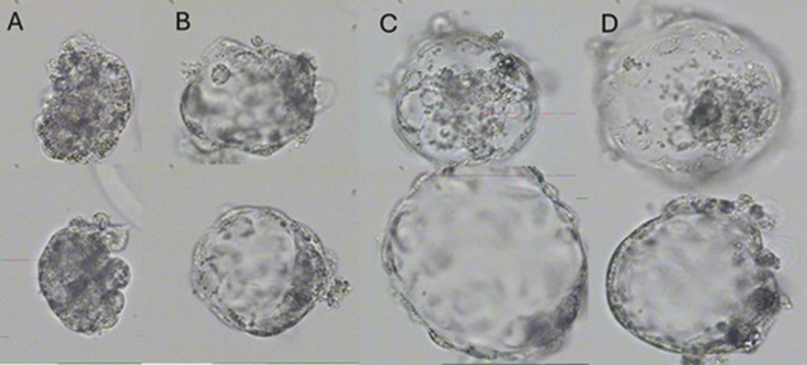 Figura 1 Cultivo de hemiembriones por 72 h A) Hemiembriones a 0 h de cultivo, B) Reexpansión de hemiembriones a las 24 h, C) Reexpansión de hemiembriones a las 48 h, D) Reexpansión de hemiembriones a las 72 h