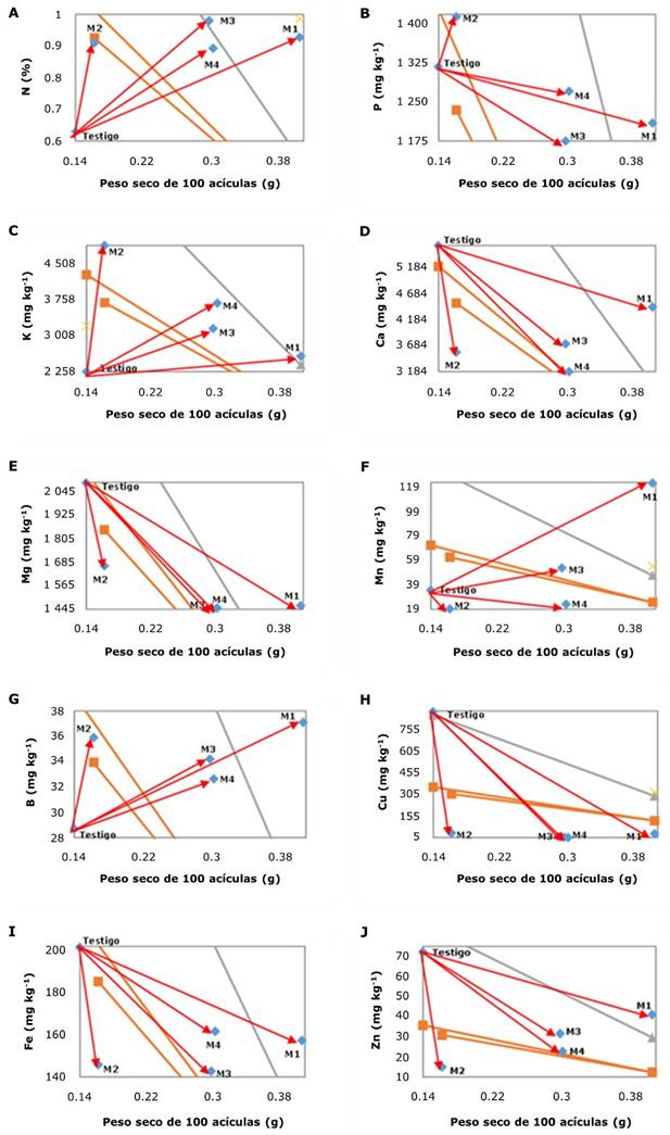 Las tendencias se comportan de forma similar en las concentraciones de N (Figura 1A), K (Figura 1C) y B (Figura 1G). Por otro lado, las gráficas de Ca (Figura 1D), Mg (Figura 1E), Cu (Figura 1H), Fe (Figura 1I) y Zn (Figura 1J) reflejan otro grupo de tendencia, lo que fue común en todas las mezclas, pues reflejaron un incremento del peso seco de las acículas. El P (Figura 1B) a excepción de M2, muestra la misma tendencia que el segundo grupo. Esto también se observa para el Mn (Figura 1F ),a excepción de la M2, cuya tendencia coincide con la del primer grupo.