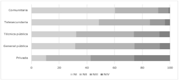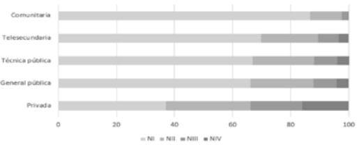 Si se observa la totalidad de las modalidades de educación secundaria, se puede notar que la tendencia es constante, ya que los alumnos que obtienen indicadores de insuficiencia -esto es Nivel I- son mayores en las escuelas públicas y se disparan en las escuelas comunitarias y telesecundarias, de las cuales sabemos que 9 de cada 10 se encuentran en comunidades con media, alta y muy alta marginación (INEE, 2018b). En contraparte, los alumnos con logro sobresaliente -ubicados en Nivel IV- asisten mayoritariamente a escuelas privadas (véanse los Gráficos 1 y 2).