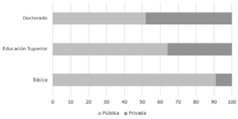 Pero existe otro dato que alerta sobre la reproducción de las desigualdades. Se trata de la ampliación en la cobertura privada de educación superior, la cual, como se ha mencionado, se incrementa desde 9% en niveles básicos (preescolar, primaria y secundaria) hasta casi 50% en doctorados (Gráfico 3). Estos datos refieren una doble exclusión: la que implica la reducción de la cobertura, por un lado, y el fortalecimiento de la educación privada por el otro. Y es que el ideal igualador de la educación se desdibuja cuando se aplican las recomendaciones del Banco Mundial, desde donde se sugiere que se impulsen políticas de mercado en el sistema educativo, formando estudiantes que desarrollen capacidades en función de las necesidades externas para que puedan adaptarse al mercado laboral, pero dejan de lado los conocimientos que forjan identidades y cultura (Belsasso, Fernández, 2012).