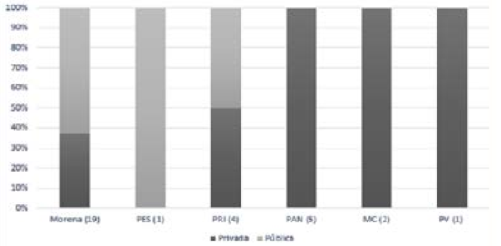 En los legisladores de la entidad se observa que 70% realizaron estudios en instituciones privadas, destaca que la totalidad de los diputados de representación panista manifiestan ser egresados de una institución con financiamiento privado.