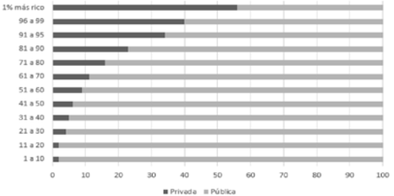 Cabe agregar que en las universidades de elite privadas, que cobran colegiaturas mensuales de decenas de miles de pesos, asisten prácticamente alumnos de los hogares más ricos del país. Pero el acaparamiento de las mejores escuelas del sistema educativo nacional por los estratos más ricos no sucede sólo con las universidades privadas, pues mientras que año con año 9 de cada 10 alumnos no es aceptado para ingresar a la UNAM, sucede también que 7 de cada 10 alumnos que asisten a la máxima casa de estudios del país pertenecen a hogares que se ubican entre el 40% de la población más rica. En resumen, los más ricos invariablemente están sobrerrepresentados en todos los escalones del sistema educativo (Jaramillo-Molina, 2021).