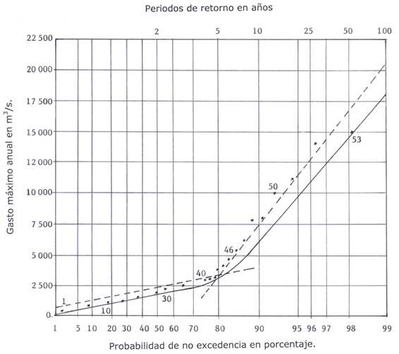 En la Figura 2 se tienen dibujados, en el papel de probabilidad Gumbel-Powell, los datos del registro en la estación La Cuña en intervalos de cinco valores del 1 al 50, y de ahí en delante de 1 en 1. Con líneas punteadas se muestran las rectas que representan a las dos poblaciones y con línea continua la distribución TCEV calculada con el método de maximización de la función objetivo. Se observa que el modelo TCEV representa de forma excelente a todas las crecientes.