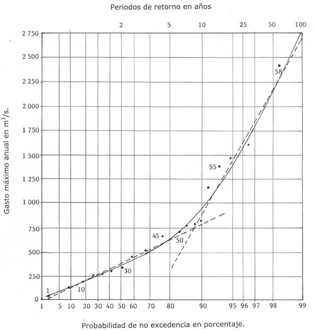Desde la mitad del siglo pasado cobró interés la presencia de dos propiedades estadísticas observadas en los registros de gastos máximos anuales. La primera se llamó “efecto pata de perro” (dog leg effect), designada así por Potter (1958). Se observa al dibujar en el papel de probabilidad los datos y encontrar un cambio brusco de pendiente debido a la presencia de valores dispersos (outliers). La segunda propiedad se denominó “fenómeno de separación”, estudiada y documentada por Matalas, Slack y Wallis (1975), quienes dibujaron en las abscisas los valores promedio de los coeficientes de asimetría o de sesgo, y en las ordenadas sus respectivas desviaciones estándar de los registros sintéticos generados con las FDP más comunes. Al llevar a tal gráfica los puntos de los registros históricos disponibles de gastos máximos anuales en cada una de las 14 regiones hidrológicamente homogéneas de EUA se observó que las FDP quedaban por debajo de los puntos reales; esto indicaba que tales FDP no podían representar la variabilidad muestral que tienen las crecientes.