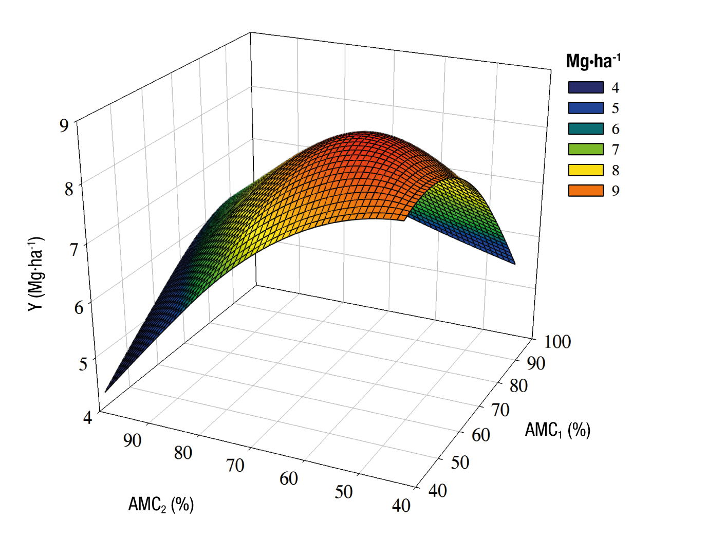 By means of regression analysis, the observed cotton yield (Y) data were fitted as the dependent variable and AMC at the time of irrigation as the independent variable, which generated the following function: