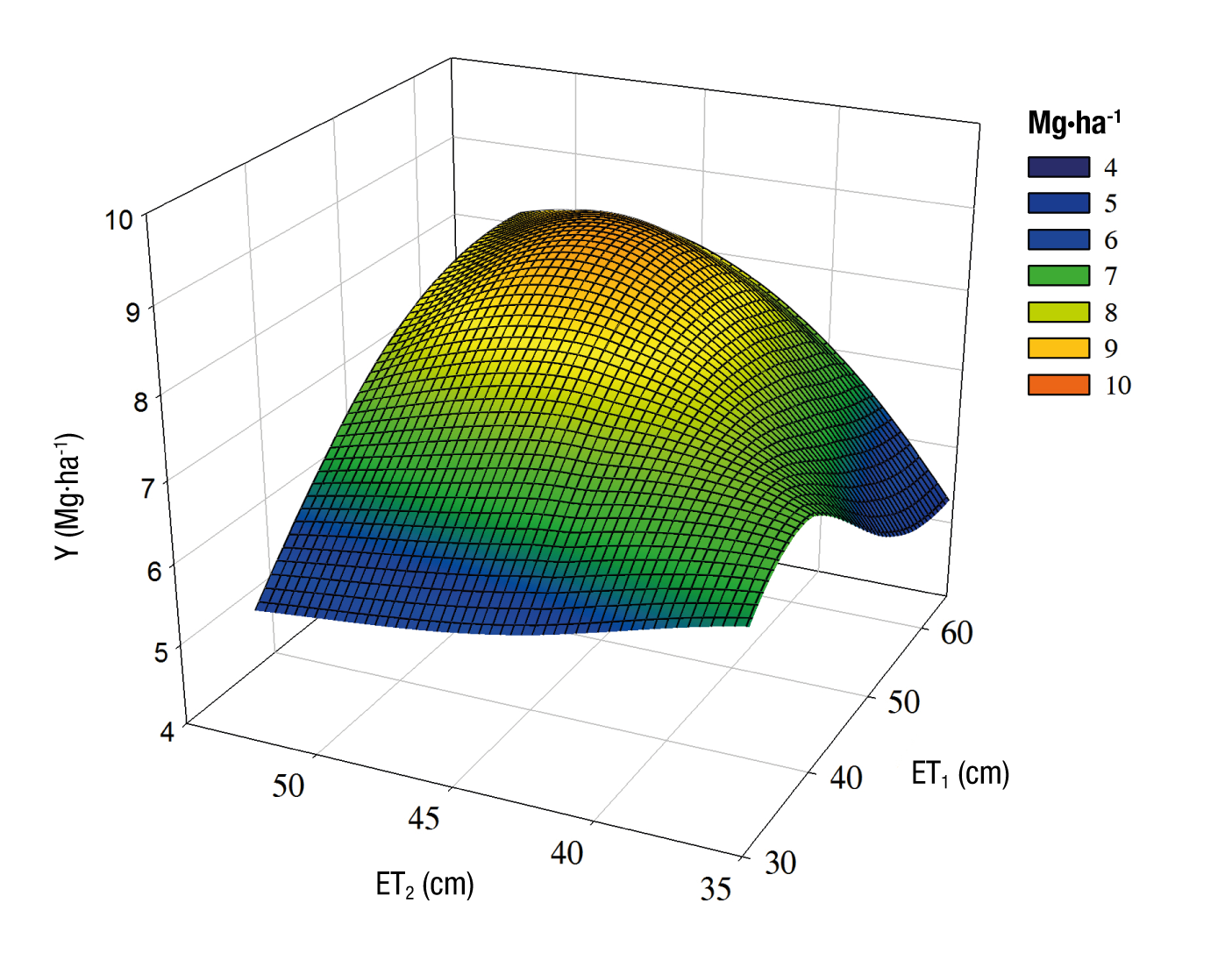 Figure 2 Response of the cotton crop to different water consumption levels. Y = yield; ET1 and ET2 = water consumption of cotton in the germination to onset of flowering stage, and from there to physiological maturity, respectively.