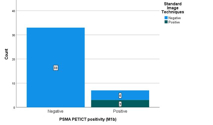 In the TNM classification, it was observed that, in the detection of bone metastases (M1b), out of 7 cases where the PET PSMA gave positive results, the standard methods were negative in 57% (n=4) of them (Figure 2).