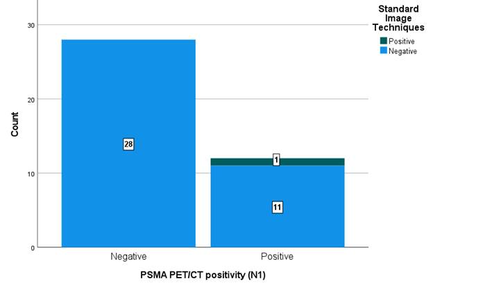 In addition, in the detection of locoregional adenopathies (N1), out of 12 cases where PET PSMA gave positive results, standard methods were negative in 92% (n=11) of them. (Figure 3).