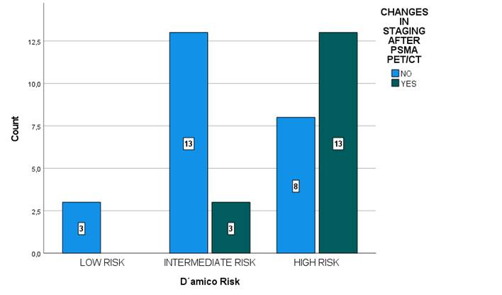 When correlating the change in staging from the PSMA PET with the D'Amico risk score, it was observed that there were no changes in the low-risk group, 19% changes in the intermediate-risk group, and 62% changes in the high-risk group. These differences were statistically significant (χ^2=9.2; df=2; p=0.01) (see Figure 4).