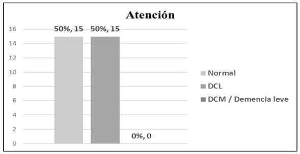 En lo que respecta a las funciones cognitivas de atención y memoria (Figura 1), se pudo identificar que la atención de los participantes se encuentra distribuida en dos niveles Normal 50% y Deterioro cognitivo leve (DCL) 50%.