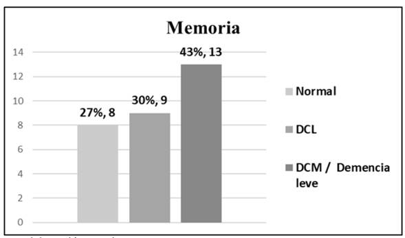 Por otra parte, al evaluar la memoria de los participantes, la mayoría de los consumidores presentan DCM (43%) o probable demencia, seguido de los que padecen Deterioro Cognitivo Leve con un 30% (Figura 2).