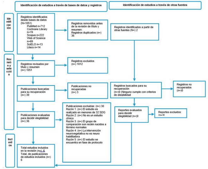 De los 1051 estudios seleccionados, se evaluó la elegibilidad de 36 en la selección final. Se excluyeron un total de 30 artículos de texto completo porque eran estudios realizados en menores de 32 semanas, no eran estudios clínicos, el grupo de comparación son recién nacidos a término, la intervención neurovegetativa no es neuro habilitadora y el estudio se encuentra en fase de protocolo. Seis estudios cumplieron los criterios de inclusión, mismos que no fueron adecuados para el metaanálisis porque la intervención o el instrumento utilizado para medir el neurodesarrollo del prematuro fueron distintos, estos resultados se muestran en el diagrama de flujo del estudio PRISMA (Figura 1).