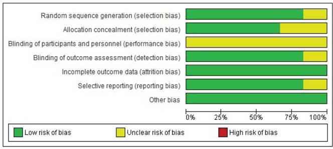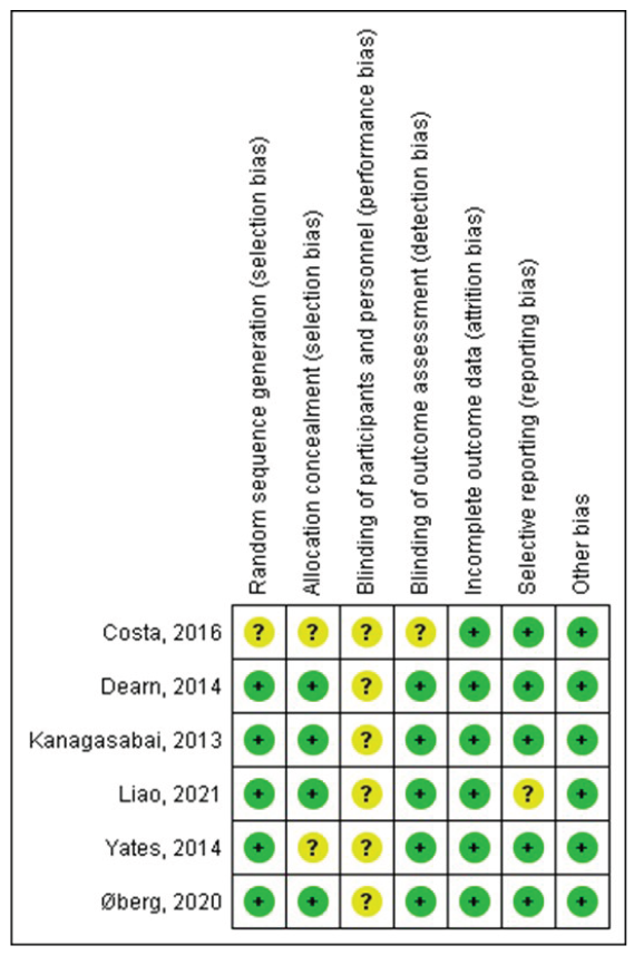 Evaluación de la calidad de estudios: se examinaron los estudios en busca de posibles sesgos metodológicos utilizando los criterios RoB-2 de la colaboración Cochrane 11, y se encontró que la calidad metodológica general de los 6 estudios es aceptable (Figuras 2 y 3).